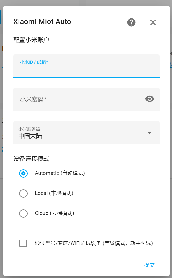 如果你只使用这一个集成来控制所有配件,包含你账号上所有的配件,你可以直接点击“提交”。配置结束