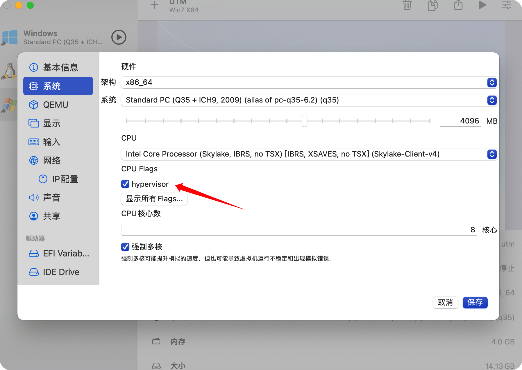 我四处排查问题,直到我发现在UTM的CPU模拟设置中有这样的字样:Hypervisor。