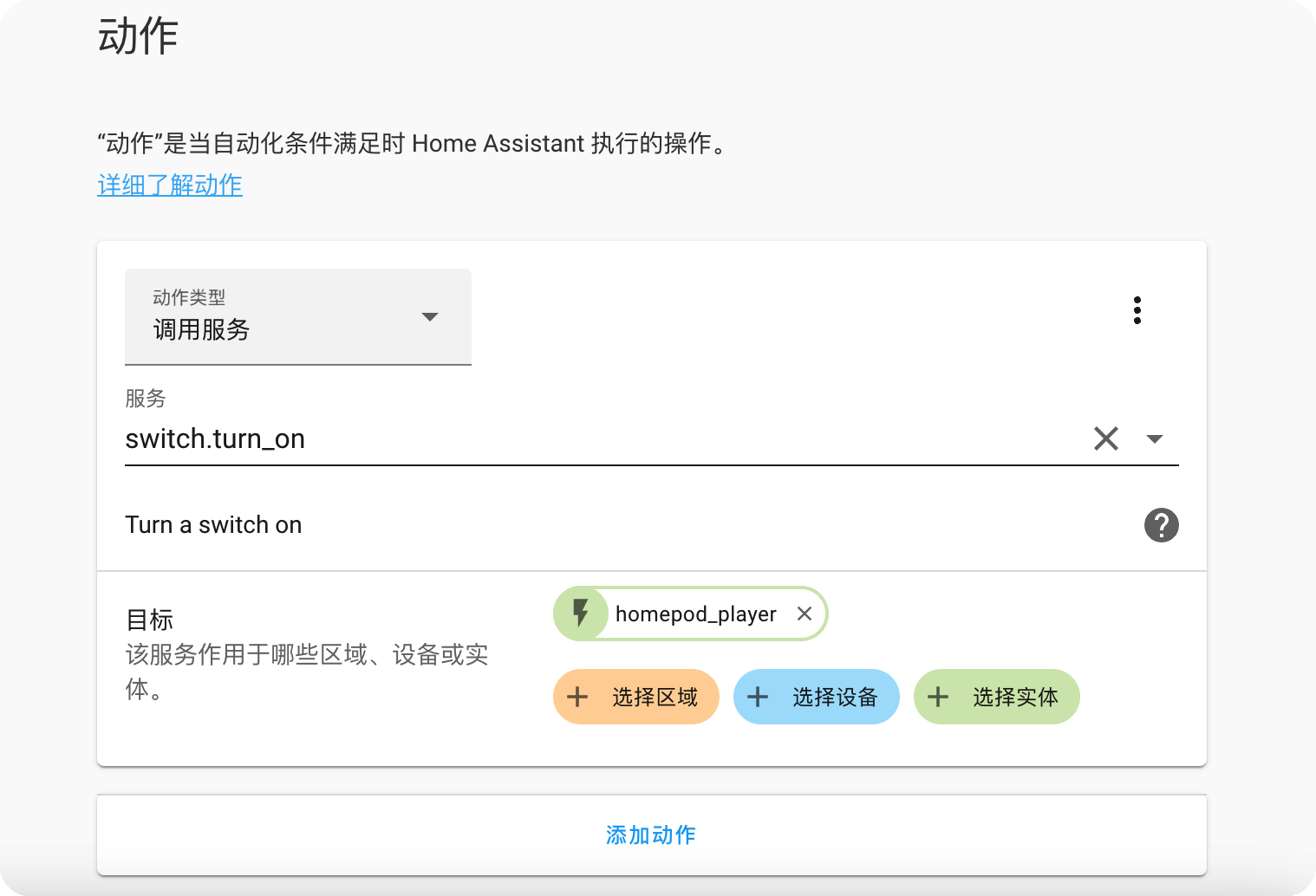 动作类型选择调用服务,服务内容选择打开开关,目标选择为我们刚刚添加链接的虚拟开关。