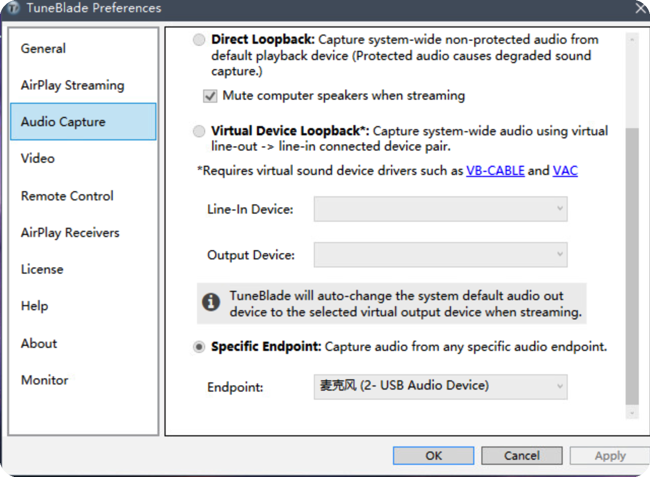 2、在Windows上安装TuneBlade应用程序,通过选择的方式实现音频转发(极低延迟)